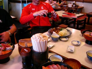 WESTERさん、MASAYAさんとは久し振り。会えてとても嬉しいです! デザイン最強伝説ハ・ジ・マ・ル KAWASAKIが大好きなのに電気系統とかの話は・・いや、 そして皆さんで、丸天というお店に早めのお昼を食べに行きました♪ 私のデジカメ写真より、見せてもらったオヤジさんの携帯写真の方が こ、このタイプ‥ WESTERさんは、コロコロステーキ的な美味しそうな定食でした♪ すごいですね、お刺身が大きいですね、 記念にパターン違いでキューピー買いました