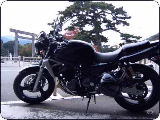 先日の琵琶湖の疲れもなんのその、起きたら雨が降っていないことに喜んで、 三連休のラストである昨日は地元を走ってきました。 まずは伊勢神宮の内宮。 到着したのは8時半ごろですが、すでに参宮客がたくさん。 もうちょっと早く着たら鳥居のところにバイク停めて写真とれたかも(=v=) バイクを止めたらまずは参拝よりも先に「おはらい町」散策です。 ここはバイクも入れるから、人がいなかったらバリ君のナイスショットを‥!と思ってたのですが、すでに開店準備に賑わい始めてました。 やっぱりもうちょっと早くこなきゃ‥!気を取り直して、早く来た時のためにナイススポットを探し。 (てこね寿司が人気のすし久と、既に人が並んでいた赤福) お土産や食事どころが並んでいるのがおはらい町です。 おはらい町からT字にぶつかるようにしておかげ横丁。ここはバイクでは入れません。 ここもお土産や軽食がたくさんだけど、町並みが江戸時代の下町みたいになります。 楽しいよ!ここも休日は人で一杯。 久々に開店前ですが、おはらい町とおかげ横丁をぶらぶら散歩してから、参拝でもしてこうかなあ、、と思ったけれど、なんだか曇り空‥。 でもすこーし、鳥羽の方が明るいのです。 パ ー ル ロ ー ド が 呼 ん で い る 。 これは、行かな!! と、バイクに飛び乗り、(実際はかなりよろよろ取りまわしてましたが、気持ちだけは飛び乗りました)走り出します。 二見を抜けて、パールロード入り。 今日は車も少なくて自分のペースで走れるので、練習してる感が一杯になります(笑) 低いギアで、ボガーッとバリ君がうなります。 低すぎるのかなあ。。 でも高いと曲がれないし。 いやいや曲がれる速度まで落としたらいいのかな‥ でもそしたら遅いし! もうちょっとバイクを倒すのかな、いやいや怖いやん! 試行錯誤しながらカーブを曲がっていくと、ゆるいカーブはだんだん曲がれるような気になってきました。 小さいのはやっぱりかなり低速にならなきゃ曲がれないのですが、ゆるーい大きいカーブ、好き!! ほほほ!気持ちいい! ゆるい大きいカーブが来るたびに浮かれます。 最初は手前とバリ君のすぐ前方しか見ていられなかったのが、なんだかだんだんカーブの終点を見て走れるようになってきました! ほほほほ!! やっべ 出来てる! 首だけカーブの先みてる! ひゃっほー!かっこいい!! と、浮かれてカーブを抜けた瞬間待ってましたとばかりに直線で、かっこいい大きいバイクに抜かれた私。 ぽかーん。(O∀O;) う、後ろにいたっけ? すっと手を上げて次のコーナーに消えていくバイクとライダーさん ズキューン!! かっこいい‥!! あんなにノリノリになってた私ですが、なんだかもう あらららら? て 現実が見えたような(笑)いつから後ろにいたんだろあわわわわ 恥ずかしい。 気が付いたら譲ってたのに‥! すっかり動揺してしまったのと、そこから小さいカーブが続くのでかなり低速走行になりながらも無事展望台へ。 BMWのバイクが2台。メットが4つだから両方ともタンデムのようです。追い抜かしていったステキバイクさんはいませんでした。 バリ君を並べて停めて、しばらくBMWをチラ見。 大きい。 まだバイクを見てもなんという名前かほとんど分からないけど大きいバイクでした(それ以上はちょっと) 車ならもうちょっと車名が分かるのになあ‥。 だんだん雲行きが怪しくなってきたので、展望台からいつものようにUターンして帰ります。 帰りはバスの後ろを走っていたので低速。 おお‥ このくらいで走るのもいいかもしれない。 このくらい=20km/h↑↓ そのまま帰ってもいいのですが、20km/h走行にすっかり元気を取り戻し、 懲りずにまたのりに乗ってきた‥ 困ったものです。 ‥‥馬がみたくなってきた‥‥。 内宮で見ればよかったものの、パールロードを走ってきた今、この瞬間馬を見たくなってしまったので仕方ない! 内宮を出るときに、ものすごく渋滞していたので、次は外宮へ向かってそこで御馬を見る計画です。 運が良かったら見れます。 おりました!草音号です。平成13年生まれ。若い。興奮で写真がぶれるぶれる。並んで見ていた子供以上にギラギラ興奮して御馬に視線を送ります。その視線に居心地を悪くしたのか(笑) すぐに散歩に出かけてしまったので数分しか見ることが出来なかったけど、大きかった‥! おお、バリオス バリオスも馬です。あ~ときめいた! ここで寄り道を終了して、帰宅です。 しばらくして雨が。 お、セーフ(^^;) この日は走行距離50kmくらい。 少し前に買った冬用グローブがモコモコして運転しにくかったので、そのままそっと仕舞っていたのですが 寒かったので、再トライしてきました。 お! 結構平気です♪♪ しかも、あたたかくはないけど寒くもない!ほほ~!冬はこれで走ろう♪ (RSタイチ) ウレタンマットに手をつっこんだような なかなか気持ちいいグローブです♪ このグローブを見て父が、「けんかで勝てそうやな」と、やたら拳の山の部分が固いことを気に入って